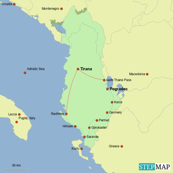Arrive to Tirana Airport or rail station and transfer on your own to your hotel; taxis are readily available. Tour ends in Radhimë, and your return transfer to Tirana (city or airport) is included.