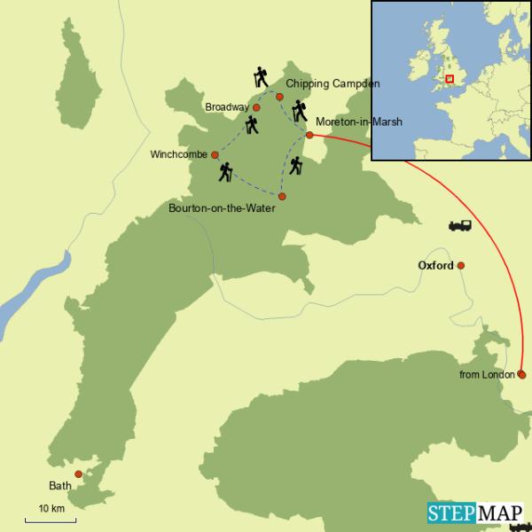Your self-guided Cotswolds hiking tour begins and finishes in Moreton-in-Marsh, easily accessible by train from London (~2 hours.)