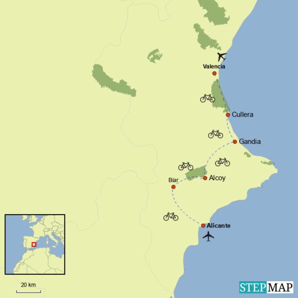 Valencia, Spain Self-Guided Greenways Bike Tour: Embark on a self‑guided cycling adventure from Alicante to Valencia, part of the renowned EuroVelo 8 – the Mediterranean Route. The majority of your journey unfolds along Greenways, bike paths, and quiet lanes away from traffic, making it an ideal way to pedal at your own pace in the heart of nature. Ride the celebrated Maigmó Greenway with its pine forests and historic viaducts, follow former railway paths beside rivers and valleys, and enjoy coastal promenades, medieval castles, wetlands, orange groves, and the rice fields of Albufera Natural Park. Along the way, savor the region’s culinary treasures—from fresh seafood and traditional fideuà in Gandía to the rich wines and farm‑to‑table flavors of Valencia’s fertile countryside. Each day offers not only stunning landscapes but also the chance to indulge in authentic Mediterranean cuisine and world‑class wines that make the journey as delicious as it is memorable. With carefully planned routes, authentic local cuisine, and seamless support, you’ll experience the perfect blend of challenge and relaxation. End your ride in Valencia’s stunning City of Arts and Sciences, carrying home unforgettable memories of Spain’s landscapes, heritage, and flavors — all experienced sustainably, on two wheels.